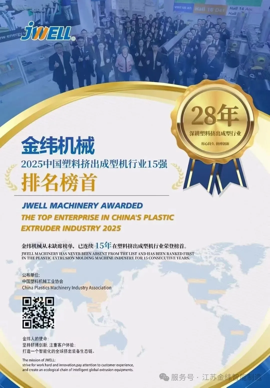 Perseverance, Innovation, and User Experience — JWELL Machinery has proudly ranked No.1 in the plastic extrusion machinery industry for 15 consecutive years.
